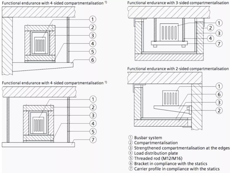 對于母線槽系統(tǒng),可根據(jù)設(shè)計和類型與母線槽系統(tǒng)一起訂購符合DIN 4102-9防火等級S60,S90和S120的建筑物各個防火區(qū)域之間的防火墻 。防火墻必須至少具有與相關(guān)墻壁或天花板相同的耐火等級。