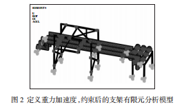 3.4載荷,束縛的模仿界說重力加速度9800mm/s2,在支架立柱底端及其他相應方位施加束縛。如圖2所示,為界說重力加速度,束縛后的ANSYS仿真圖。