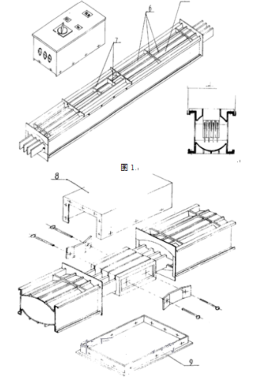 通過對母線槽的改良設計,在母線槽的蓋板、側板連接處、插口處、接頭處都設計防水結構,設置防水嵌件。如圖1:利用插口處加強筋的凸起部分(7)和插接箱底部的凹槽相配合,以解決插口處的防水問題。如圖2:用接頭防水上罩(8)和接頭防水底板(9)與母線槽相配合,已解決解決接頭處的防水問題。