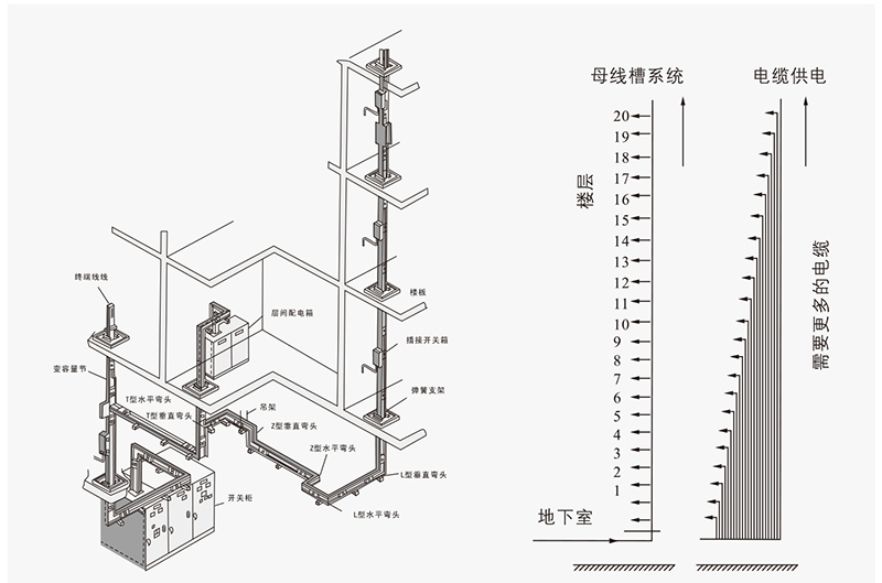 右圖為傳統的電纜供電方法,每層樓面都需要單獨放線,需要很多電纜。