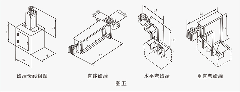 始端母線與始端進線箱配套組成母線槽與電纜、配電柜、變壓器的連接件(圖五)作用于母線槽的電源輸入或輸出端,始端母線分:直線始端,水平彎始端,垂直彎始端。始端進線箱外形尺寸W×H視用戶的電器設備尺寸而定。見圖五
